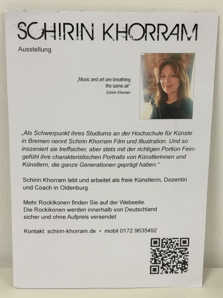 Von 2003 bis 2010 hat Schirin Khorram ihre Kunstschule in Oldenburg/ Etzhorn geleitet, hat Workshops gegeben und als Illustratorin und Designerin gearbeitet, bis sie 2010 nach Augustfehn zog. Hier hat sie zur Zeit ihr Atelier und arbeitet als freie Künstlerin.